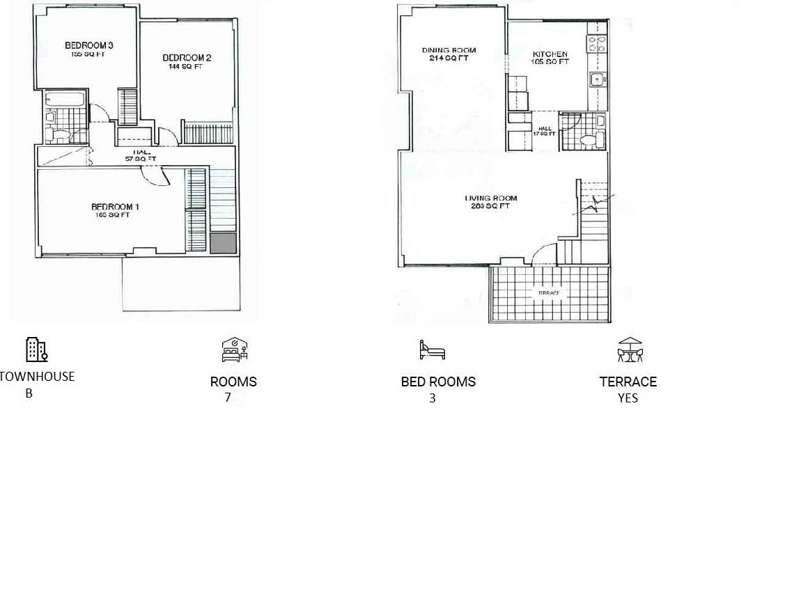 There are 236 townhouses in Co-op City, each of which has 3 floors and two apartments, a one-bedroom and a three-bedroom. The one-bedroom, which is on the ground level, has a small yard. The three-bedroom, which is a duplex on the second and third floors, has a terrace on the second floor.